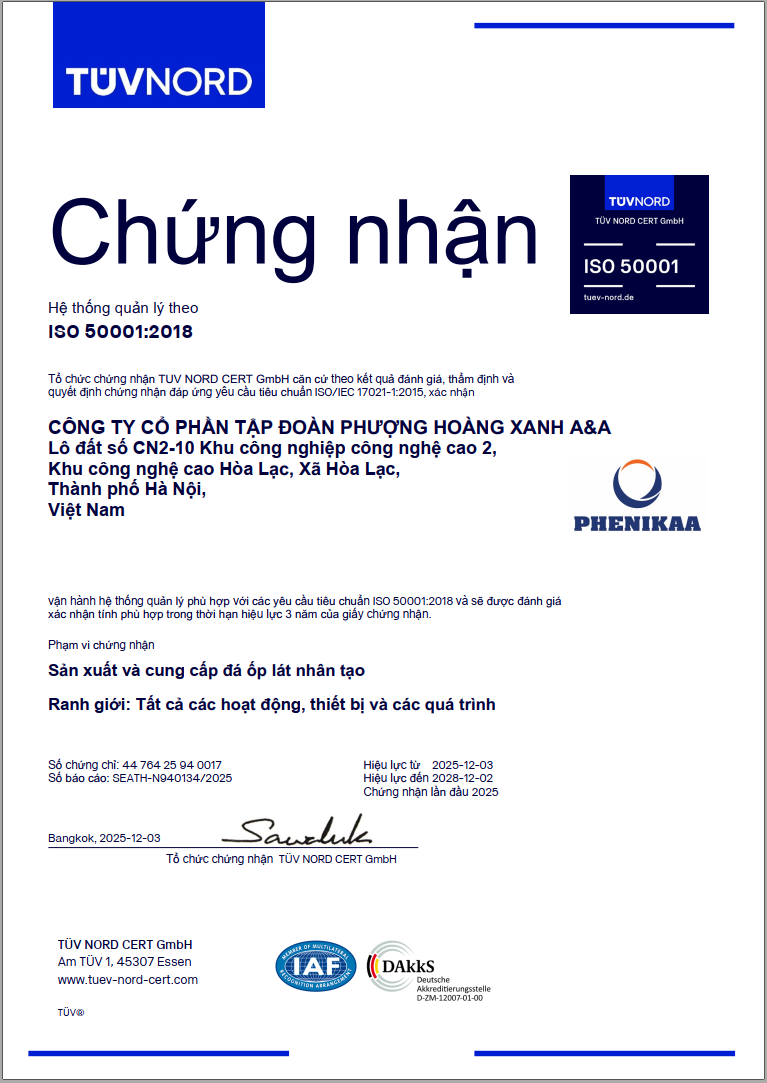 ISO 50001 được Tập đoàn lựa chọn triển khai có chứng nhận tại các đơn vị nòng cốt của lĩnh vực SXCN gồm Vicostone, Nhà máy Phenikaa Huế và Nhà máy Phenikaa, đồng thời được ứng dụng nội bộ tại các nhà máy Hóa chất 101, Trần Long, STV, SSC theo cùng một khung quản trị. Việc Nhà máy Phenikaa hoàn thiện bổ sung thêm ISO 50001 không chỉ nâng cao hiệu suất vận hành và tối ưu chi phí năng lượng, mà còn đóng vai trò mô hình chuẩn, phục vụ mục tiêu nhân rộng thực hành tốt trong toàn lĩnh vực SXCN, thể hiện tinh thần phụng sự bằng hành động cụ thể và chuẩn mực minh bạch.