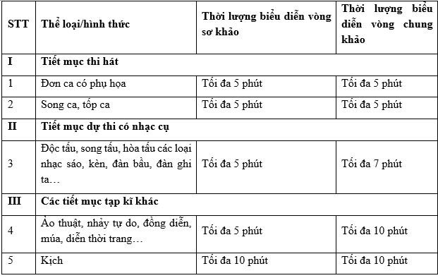 + Mỗi tiết mục chỉ được biểu diễn một lần trừ trường hợp xảy ra sự cố về kĩ thuật sân khấu, âm thanh, ánh sáng.